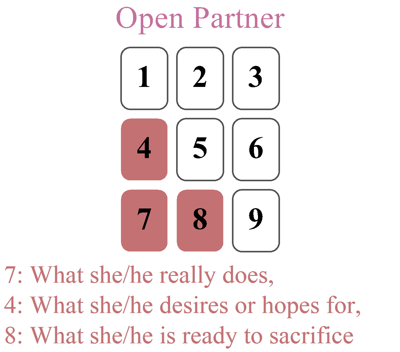 Here, the card reveals the dreams or expectations of the open partner. This may include aspirations shared with you or more personal wishes. This position helps identify if their goals in the relationship align with those of the closed partner.
