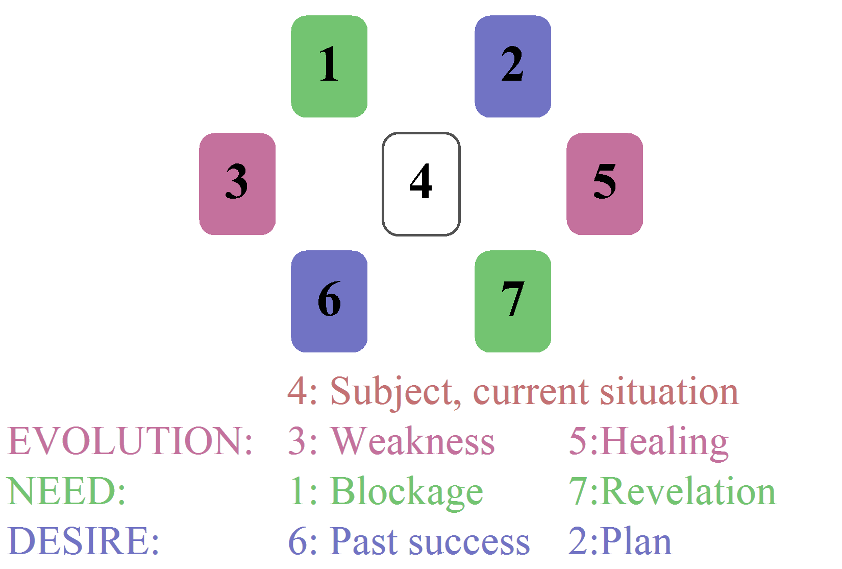 These positions reflect what the querent feels deeply, their immediate needs. These two positions encourage awareness about the reasons for past failures, helping the querent see what holds them back, and how to bounce back.