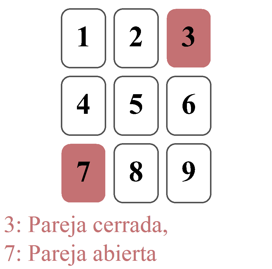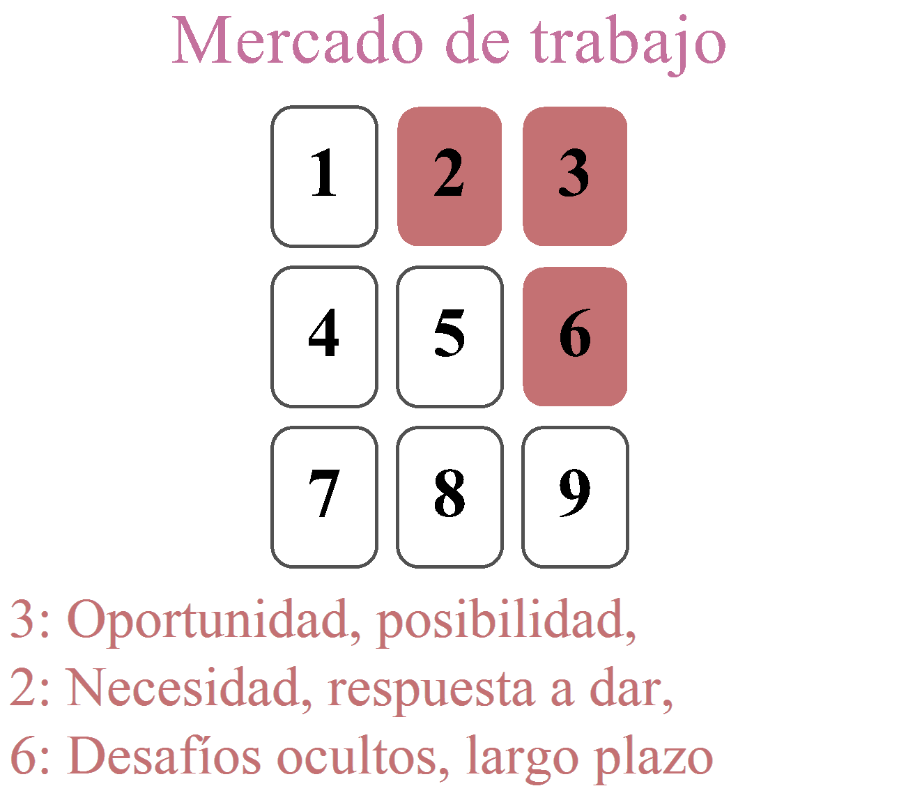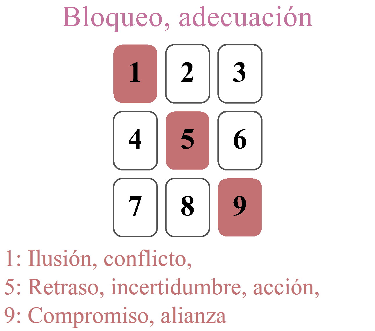 Las cartas situadas en las esquinas (1, 3, 7, 9) son indicadores importantes de las fuerzas que sostienen o bloquean el desarrollo de la situación: