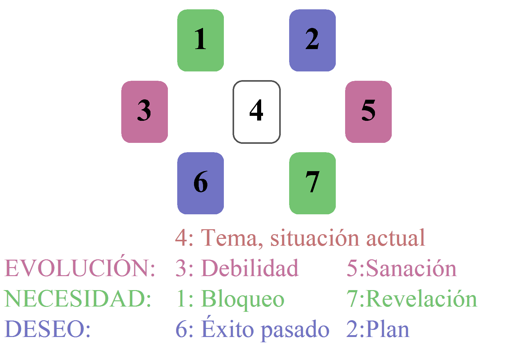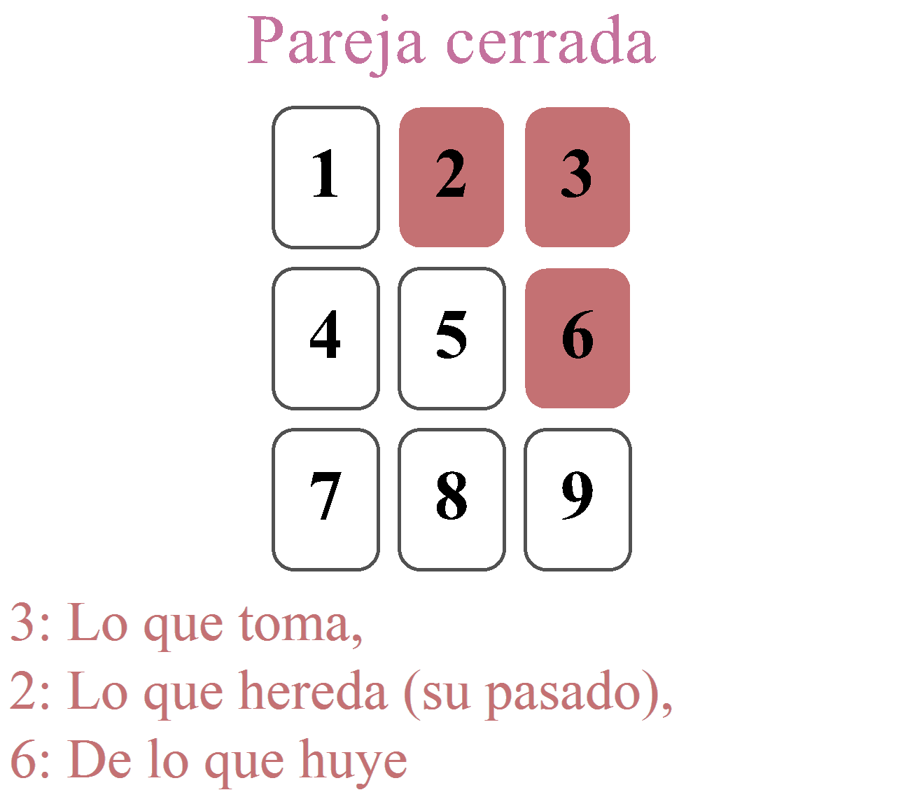 Las posiciones 3 y 5 muestran lo que cada uno aporta a la relación. La carta central (4) refleja el estado actual de la relación: su equilibrio, sus fuerzas o sus tensiones. Determinar si la relación es armoniosa o si necesita un reajuste en la manera de compartir las responsabilidades o las emociones.