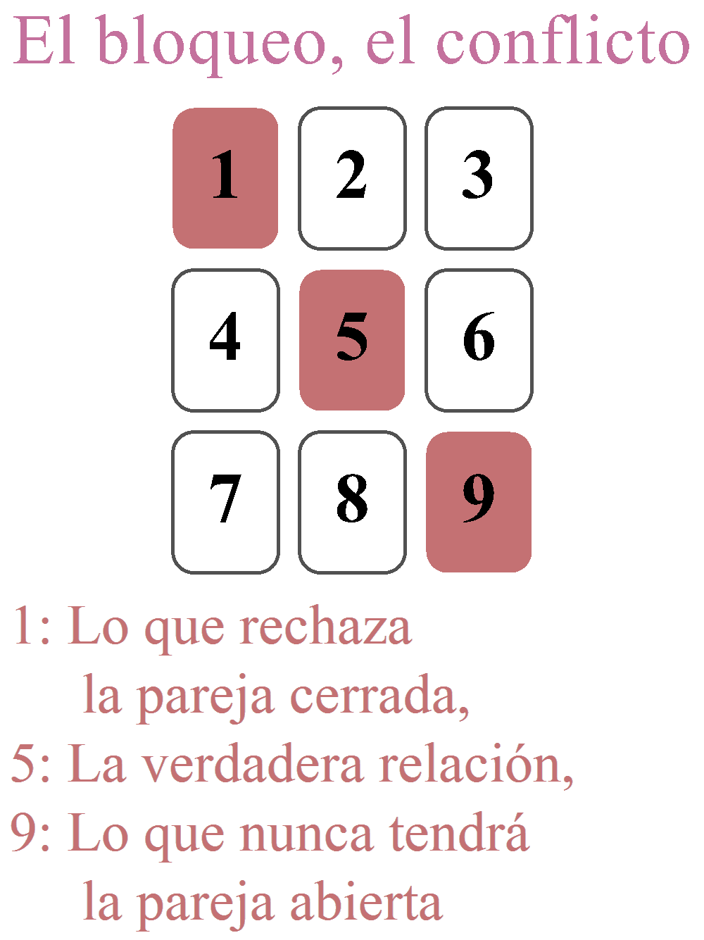 No es automático que el/la consultante esté en posición n°7. Él/ella puede estar en posición n°3 porque, por ejemplo, querría poner fin a la relación pero no sabe cómo hacerlo, o simplemente se pregunta si debe continuar la relación, mientras que su compañero no se hace (aún) tal pregunta.