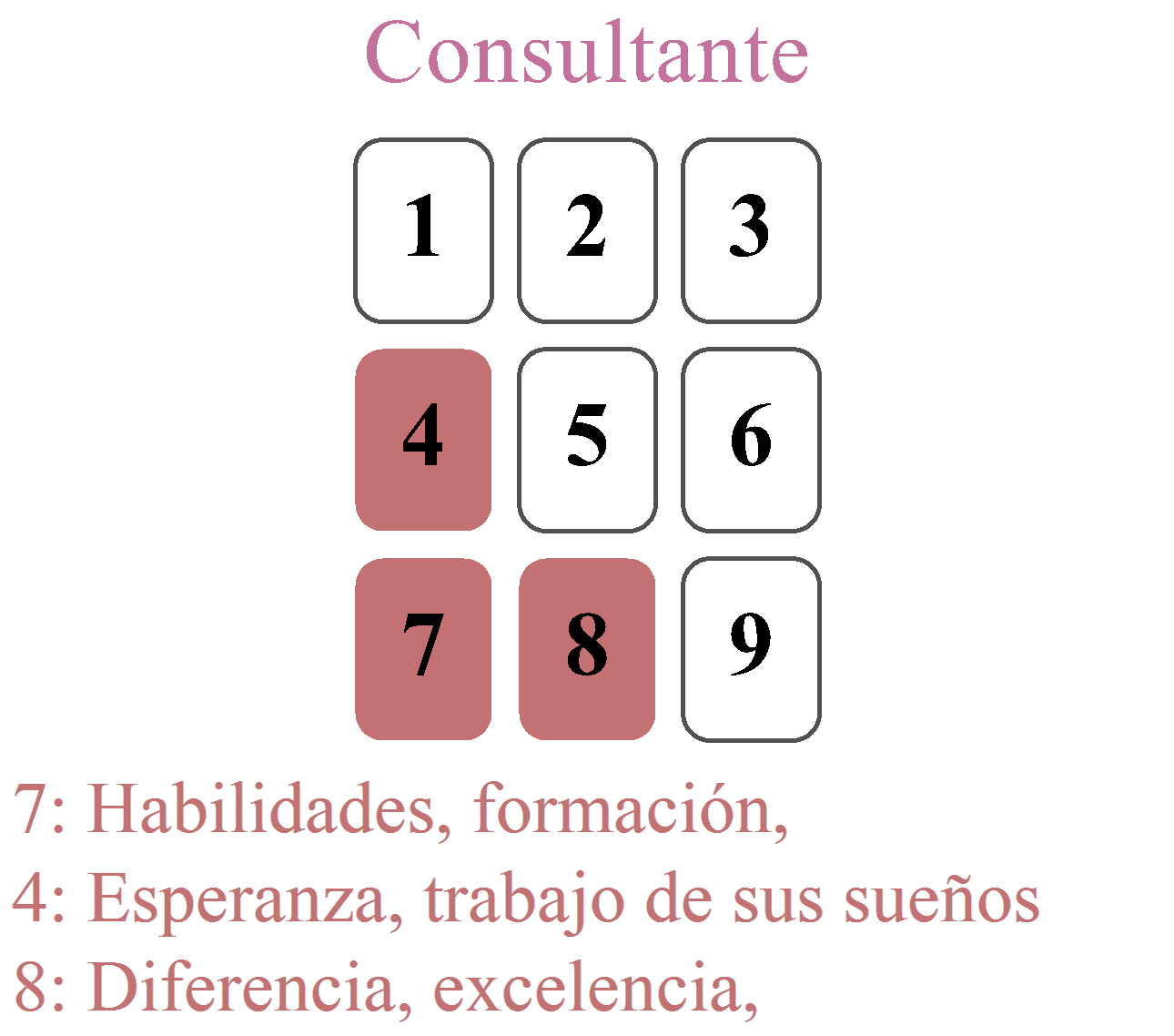 * Termina por la tercera fila (7, 8, 9) para evaluar cómo tus aspiraciones pueden transformarse en oportunidades profesionales concretas. Estas cartas te muestran pistas para poner en práctica tu Ikigai.