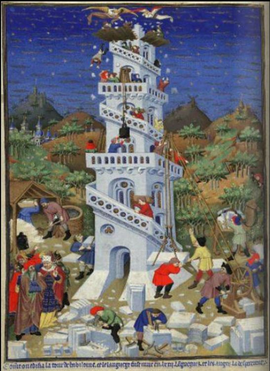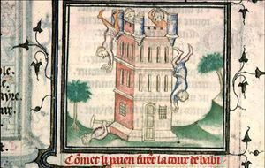 Les représentations médiévales de la Tour de Babel montrent souvent la tour en construction avec des éléments qui suggèrent la confusion et la dispersion. Certaines illustrations montrent la tour détruite par le feu, reflétant une version alternative de l'histoire absorbée dans le folklore et l'art.