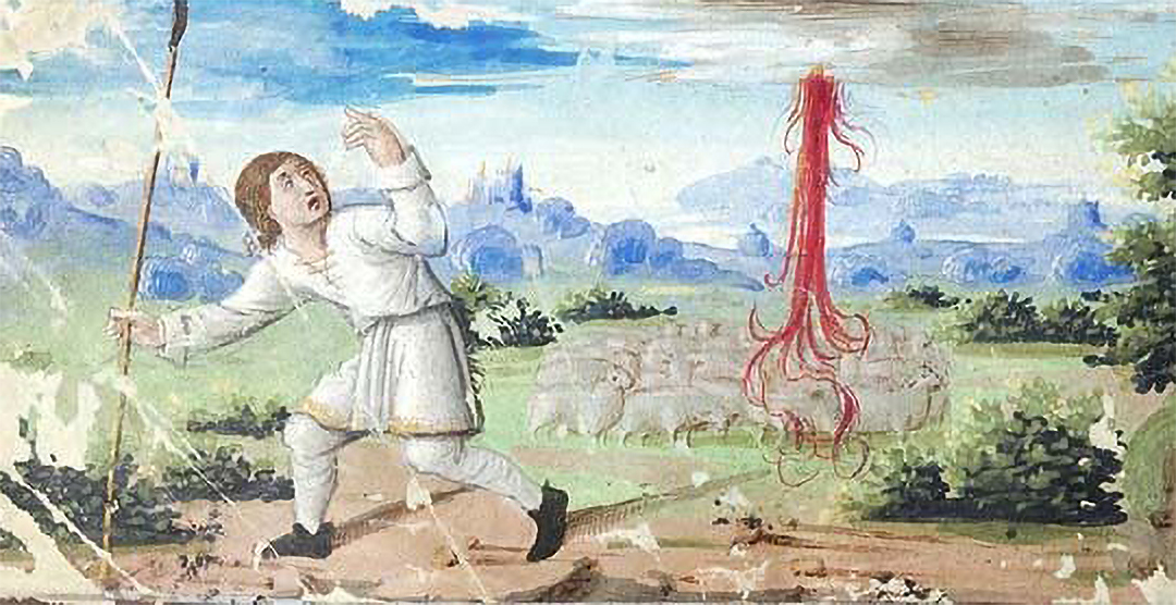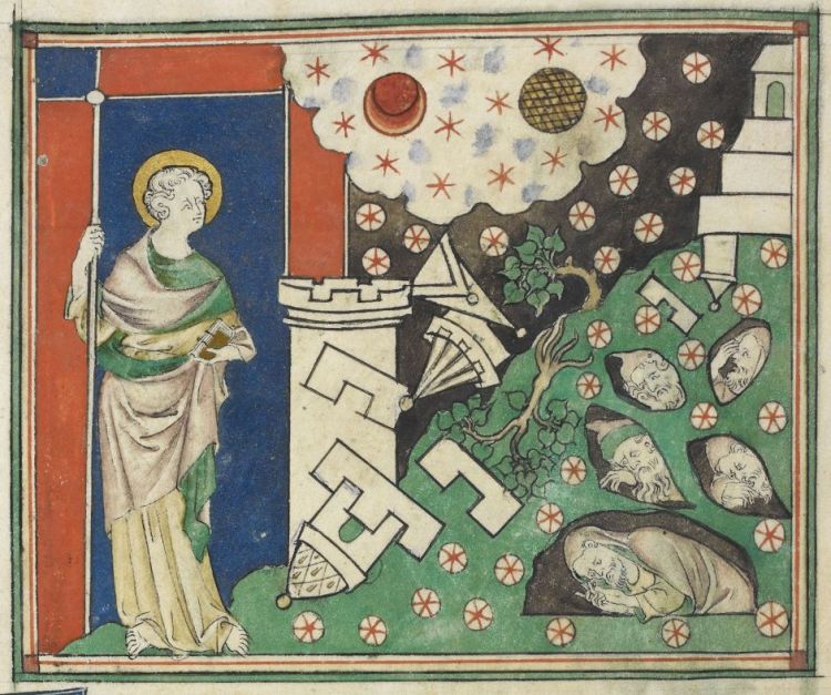 Les manuscrits enluminés médiévaux contenaient souvent des représentations de quatre histoires bibliques bien connues qui présentaient la colère ardente de Dieu dirigée contre les humains : l'Apocalypse, la destruction de Sodome et Gomorrhe, les épreuves de Job et la Tour de Babel.