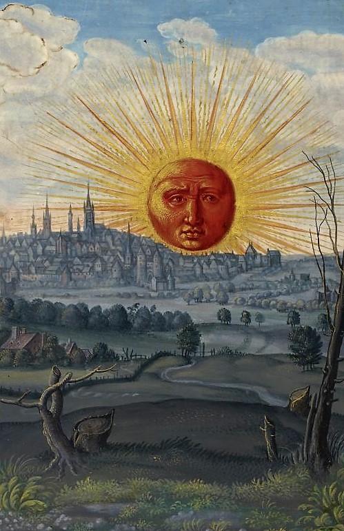 Le soleil projette des flèches de lumière multicolores - et non des gouttes comme nous avons vu dans l'article sur 18 - LA LUNE. Cette représentation s'inscrit dans la vision cosmologique de l'époque où les astres irradient littéralement leurs influences vers la terre.