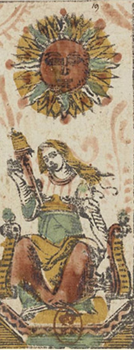Le plus ancien Soleil connu montrant une femme avec quenouille et fuseau apparaît dans le fameux tarot de Charles VI, peint pour un.e aristocrate italien.ne au milieu du 15e siècle. Cette carte établit un lien symbolique profond avec Clotho, l'une des trois Parques de la mythologie grecque qui file le fil du destin individuel.
