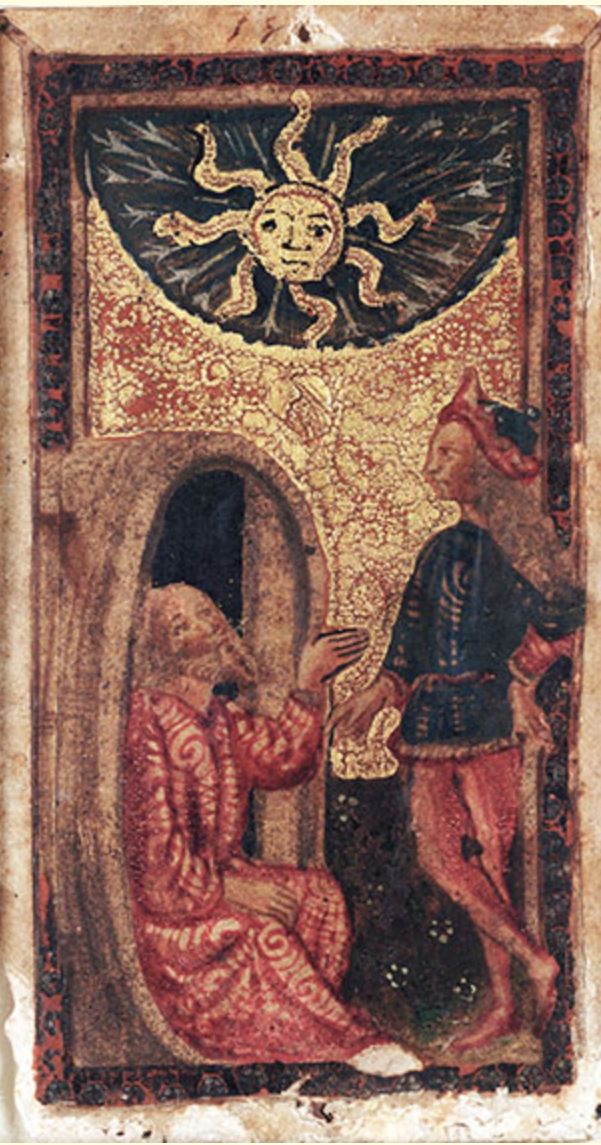 Une autre carte du Soleil, créée au milieu du 15e siècle pour le Duc de Ferrara, illustre l'une des anecdotes les plus célèbres de l'Antiquité : la rencontre entre Alexandre le Grand et le philosophe cynique Diogène. Cette histoire, rapportée par Plutarque et reprise jusqu'à Shakespeare, raconte comment Diogène, vivant dans un tonneau par choix philosophique, demanda à l'empereur de s'écarter car il lui faisait de l'ombre.