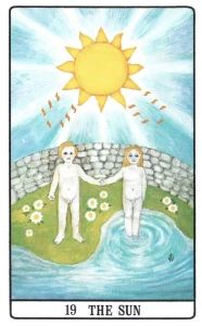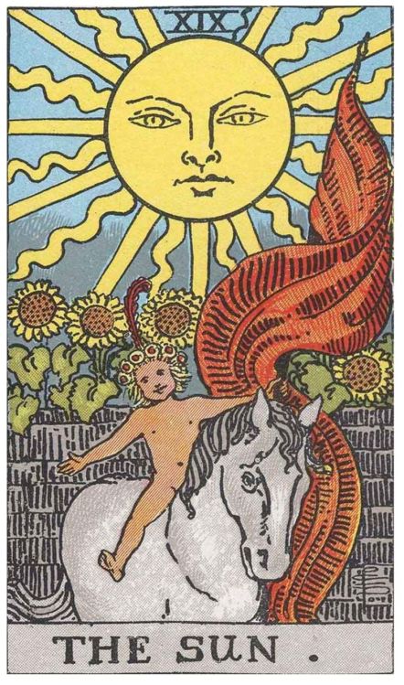 Plus fondamentalement, une idée fausse circule concernant cette carte. Tout comme 18 - LA LUNE est souvent vue comme une carte d'intériorisation, LE SOLEIL apparaît comme une carte d'extériorisation. En réalité, les deux cartes fonctionnent comme des cartes d'intériorisation. Elles nous parlent toutes deux de ce qui se passe à l'intérieur de nous. Cette prétendue extraversion qui pourrait caractériser LE SOLEIL n'est qu'une conséquence de ce qui se développe au fond de notre être. Ce que l'on émet vers l'extérieur ne fait que refléter notre transformation intérieure.